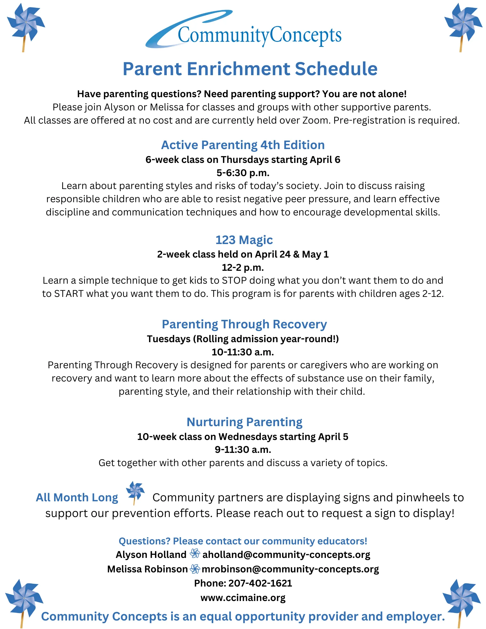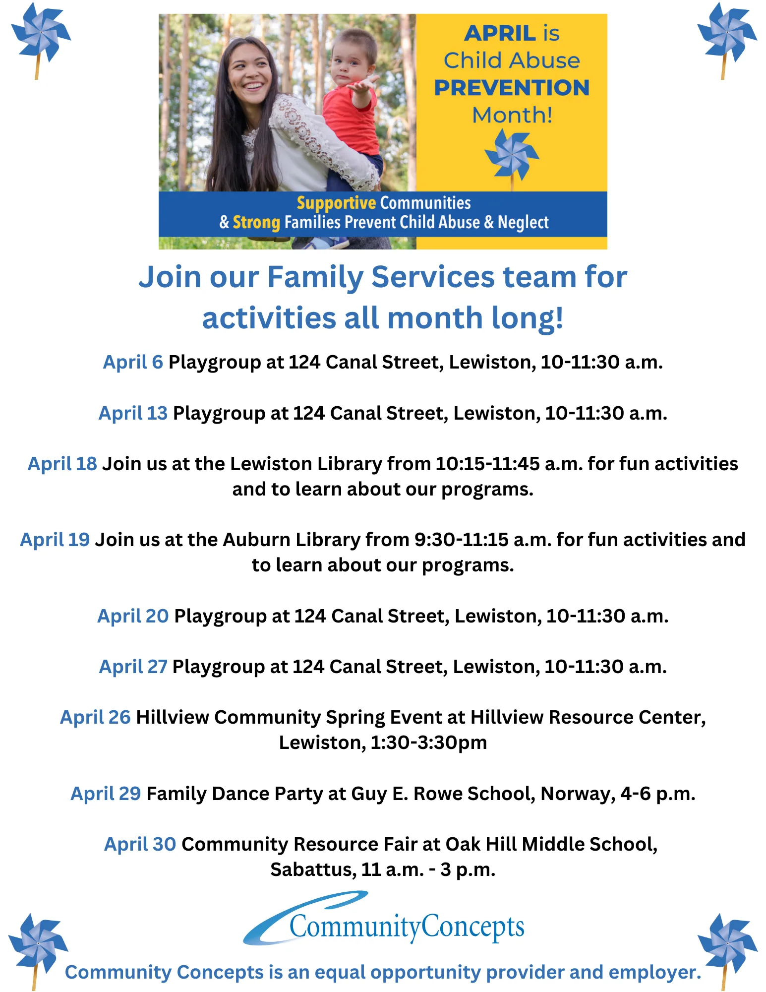 April is National Child Abuse Prevention Month. In partnership with the Maine Children’s Trust, CCI will be working all month long to share how each of us can play a part in helping children in our communities grow up safe and supported. Keep an eye out for our pinwheels, a symbol of supportive communities, and be sure to follow us on social media for events planned near you (including activities at the Lewiston and Auburn Public Libraries on March 18th and 19th)!